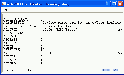 На Рисунок 11.1 видно, что в данном файле переменная ACADLSPASDOC имеет значение 0, переменная APERTURE — 5, CECOLOR — "BYLAYER" и т. д.