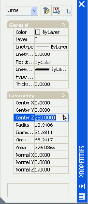 В этом окне отражены все характеристики окружности, которые при желании могут быть изменены. Щелкните дважды левой кнопкой мыши в правой колонке, напротив характеристики Center Z (Центр Z). В ячейке появится вертикальный текстовый курсор и значок устройства указания (его можно использовать, если вы хотите указать новое значение Z для центра с помощью мыши). Исправьте с помощью клавиатуры старое значение 0 на 250 (рис. 9.5) и закройте окно PROPERTIES (СВОЙСТВА).